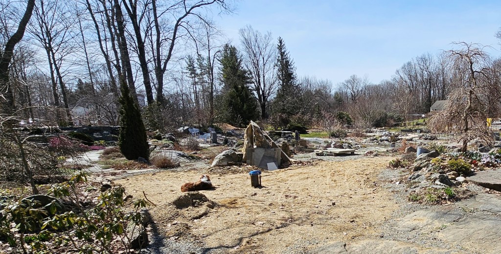 Spring is definitely in full swing here today. Somehow it got very warm overnight, after weeks of freezing morning temperatures. Hopefully this hot spell won’t last long, but we do know what’s coming. Spring offers us a time of rejuvenation. In the garden it is often short due to lack of rain. But there is that magic week where the temperatures are above freezing and it rains every night. We started the month with snow still on the ground. We got right to work cleaning up after the new well where the front entrance was devastated. Here are some before and after shots of what kept us busy here.