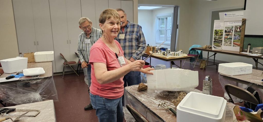 Thanks go to Maura D. We are not only wowed at her speed making two troughs, but also donating one to our chapter. We will plant it for next year’s Outreach program. That way the public can see how easy it is to rock garden, even in a condo! Yes it’s time to start thinking about next year’s public sale to attract new members.