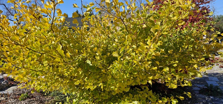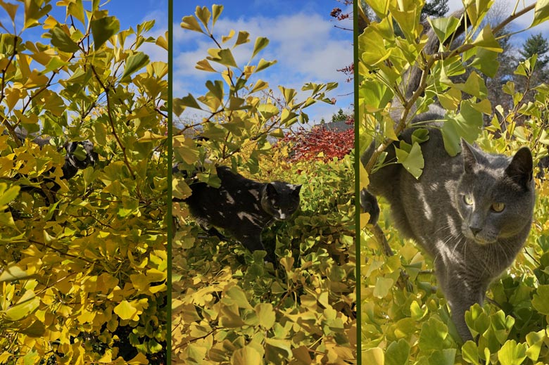 Situated next to it here is a dwarf Ginko biloba, now turning a wonderful gold shade. It is also from the same nursery. And again there were too many choices. I’m talking dozens. While a friend and I were admiring it recently, we noticed some movement in the tree. Spotted! And Maximilian emerged. “Ha!” he said with a look away.