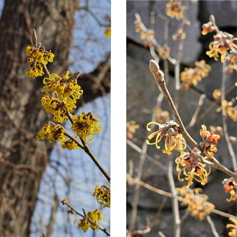 Spring landed three days ago. Pop. Wow, as there was still a foot of snow the week before. Galanthus, hamamelis, and Crocus ‘Tommasinianus’ came out within days of one another. Yesterday I switched to my Fall/ Spring coat when I walk the pups. And today, I did not need cleats to walk the trails.