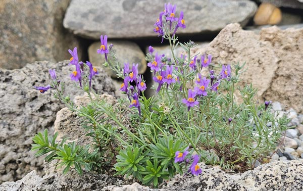 A long blooming favorite of mine is not a member of that huge tribe. Rather it belongs to the Plantaginaceae: Linaria alpina. Imagine my delight when encountering it in the high mountain Dolomites. The orange gives it such a cheery face under its purple hood.