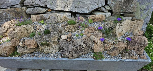 A bit lighter in color is the creeping Campanula portenschlagiana. A native of the Dalmatian Mountains in Croatia, it loves to hug the rocks. And does very well in full sun. While it is easy to grow from seed, there are several named forms, like ‘Blue Magic’, worth finding.