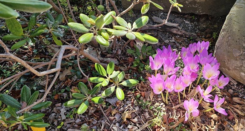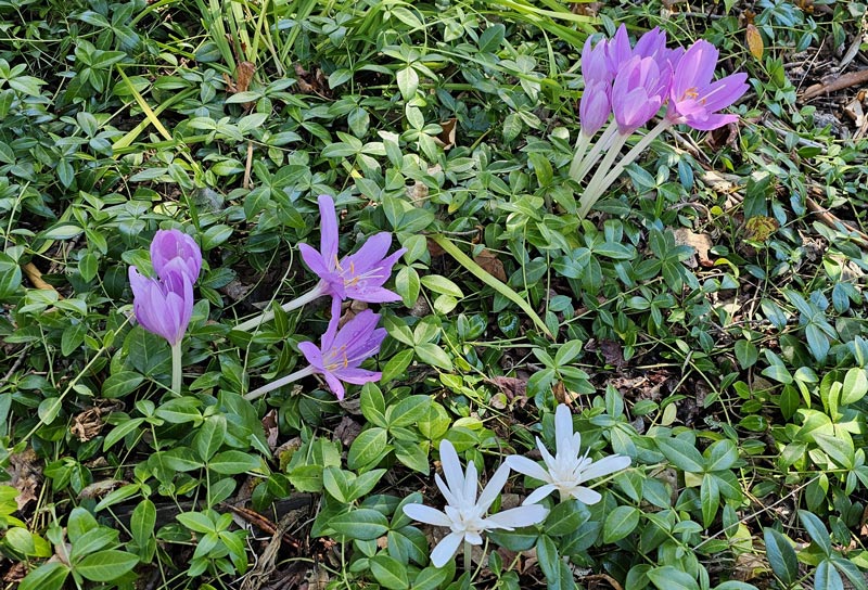Colchicum are out in force now. Although known as Autumn Crocus by the internet, they are not and point out the problem with common names. There is already a very special crocus that does bloom in the autumn: Crocus sativus, the source of saffron. Yes there are others – Crocus pulchellus and Crocus speciosus to name but two. But back to colchicum. They are much larger than crocus and will rise for a show when planted among Vinca minor.